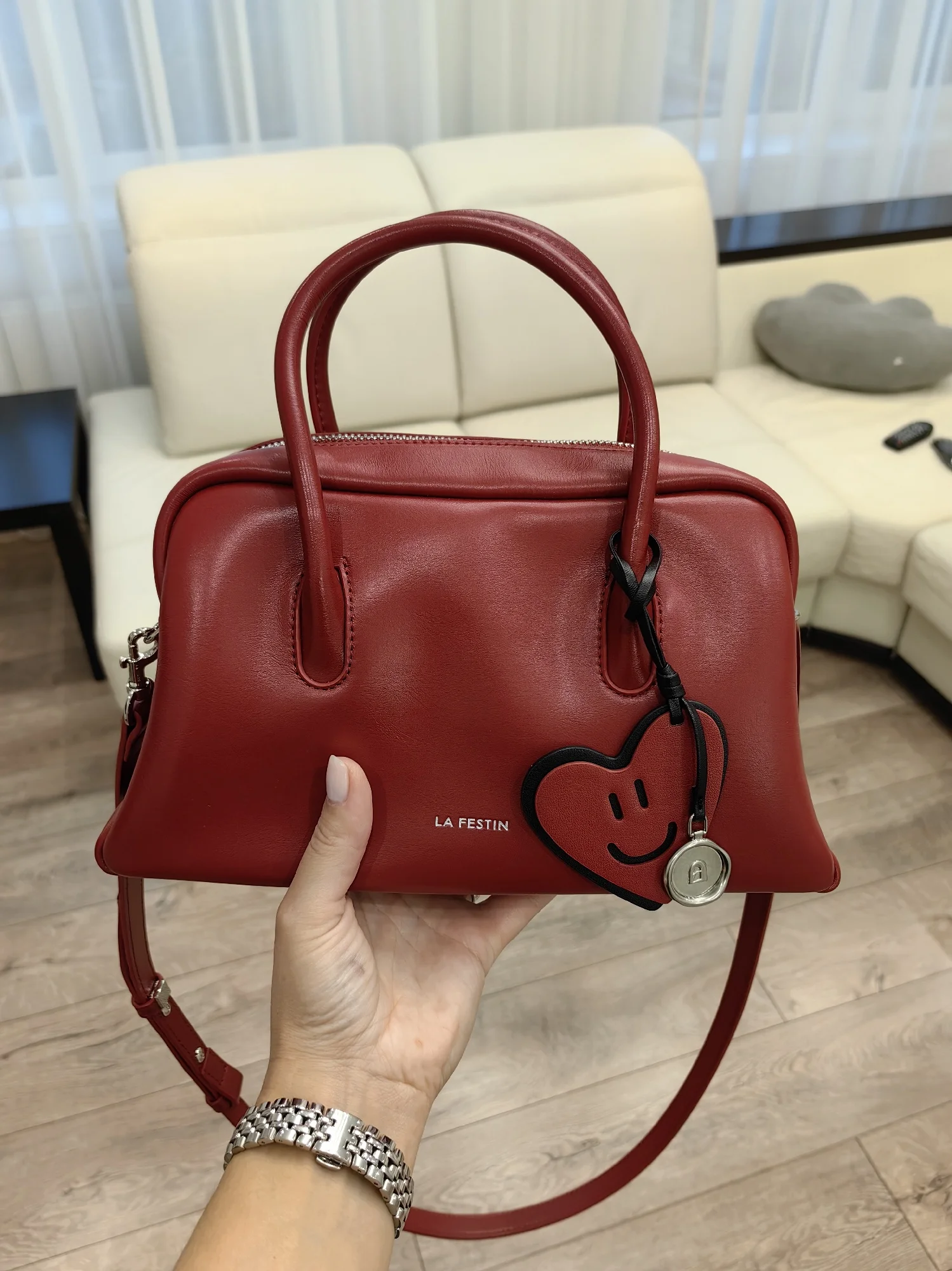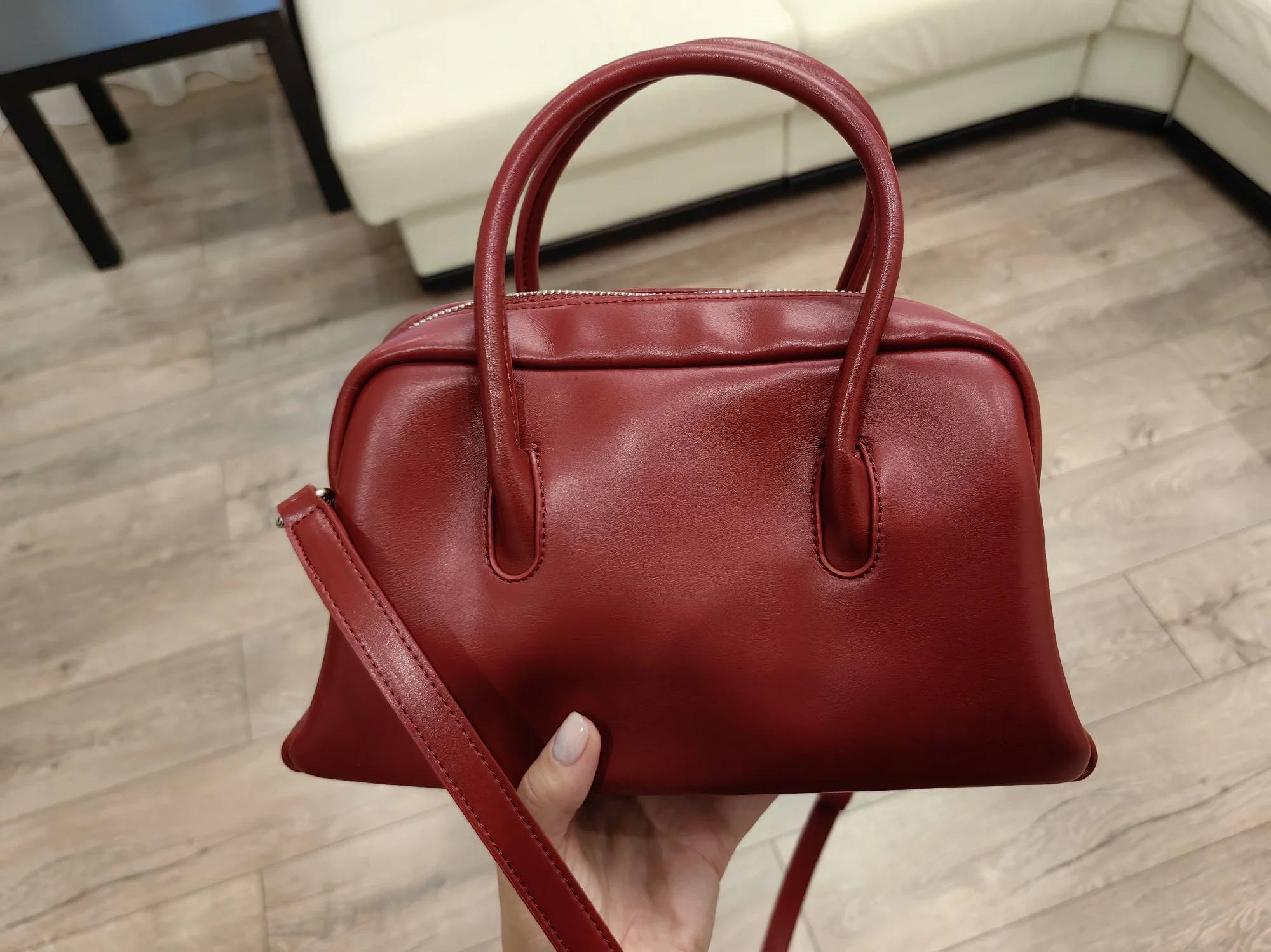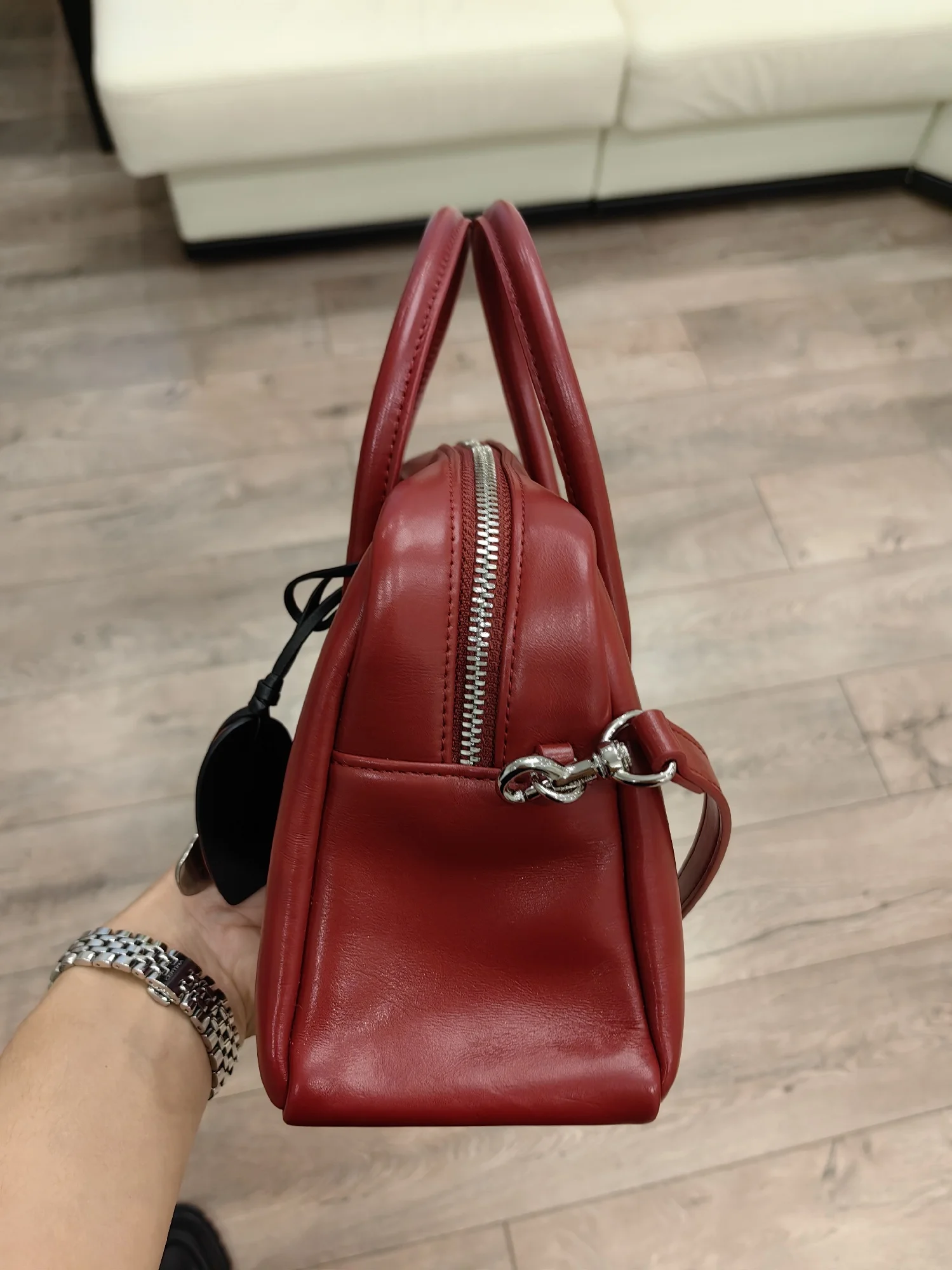 Very nice handbag! Nice smell, texture. Not big, but roomy.